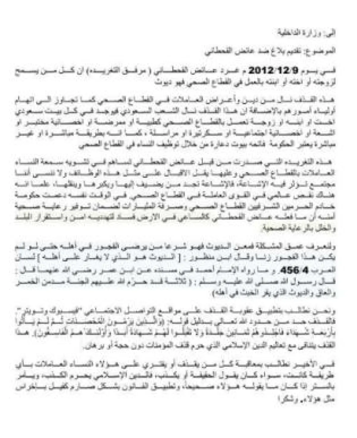 مشيرة إلى أنَّ اتهامات القحطاني طالت حتى أولياء الأمور الذين وصفهم بـ«الدياثة»، لذلك فإنَّ فعله هذا يتناقض مع سماحة الدين، وفيه منع لحريَّة المرأة التي خرجت بحثاً عن عمل شريف يضمن لها حياتها ويسهل لها أمورها وهذا أفضل من أن تنتظر معونة أو أن تشحذ، وأضافت: هؤلاء لو جاريناهم في تفكيرهم ومنعنا السعوديات من العمل في المستشفيات، فمن سيعالج أختك أو زوجتك أو ابنتك؟ ولو قلنا إنَّ الأجنبيات هن الحل فهن يعملن بشكل مؤقت، وطال الزمن أو قصر سوف يغادرن البلاد.