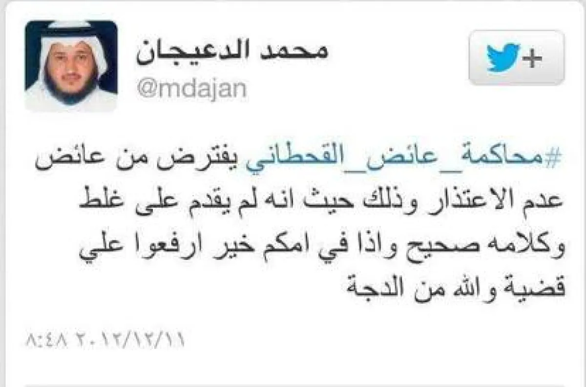 بعد التغريدة الهجوميَّة التي أطلقها عائض القحطاني على السعوديات العاملات في المجال الصحي بالمستشفيات، والموجة العنيفة التي استقبلته من المغردين عبر موقع «تويتر»، برزت العديد من الأصوات مطالبة بالتوقف عن مثل هذه الاعتداءات، خاصة على السعوديات، وعدم التعرض لهن بالقذف والشتم في الأعراض، مطالبين بمحاكمة القحطاني، وذلك عن طريق «هاشتاق» (محاكمة عائض القحطاني) و(عائض القحطاني يصف الرجال بالدياثة)، بوصفه الرجل الذي يجعل أخته أو ابنته أو زوجته تعمل في مجال داخل المستشفى بـ«الديّوث».