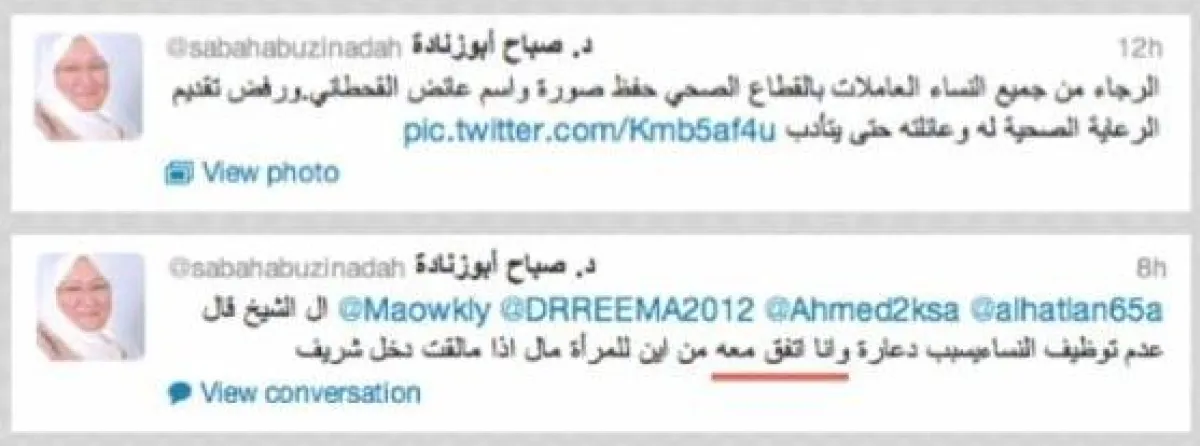 وفي ظل الجدل الحاصل على موقع «تويتر» تأثّرت الدكتورة صباح أبو زنادة، استشاريَّة ومؤسسة المجلس العلمي للتمريض بالهيئة السعوديَّة للتخصصات الصحيَّة، بما بدر من القحطاني، وأكدت بأنَّها ستقوم باتخاذ الإجراءات اللازمة لرفع قضيَّة« قذف» ضد عائض القحطاني، وقامت عبر صفحتها في «تويتر» بتوحيد من يرغب بالانضمام إليها، إلا في حال اعتذار رسمي للقحطاني عبر الصحف، وطالبت عبر صفحتها في «تويتر» بمعاقبة كل من يقذف أو يفتري على النساء العاملات بأي طريقة كانت، سواء كان يقول الحقيقة أو يكذب، فالدين الإسلامي يحرم الكذب، ويأمر بالستر إذا كان ما يقوله هؤلاء صحيحاً، وكما أوضحت فإنَّ تطبيق القانون بشكل صارم كفيل بإخراس هؤلاء المختلين فكرياً.