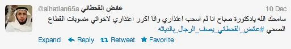 وكان آخر تصريحات أبو زنادة بأن يتقدم القحطاني لإحدى الصحف لكتابة مقال يشجع من خلاله دخول المرأة الوظائف الصحيَّة ويستشهد بالسيرة النبويَّة في تشريف هذه الوظائف ويعتذر في النهاية عما صدر منه، فإن لم يفعل ذلك حتى نهاية الأسبوع فسوف نستمر في القضيَّة من دون الالتفات إلى اعتذاره عبر «تويتر».