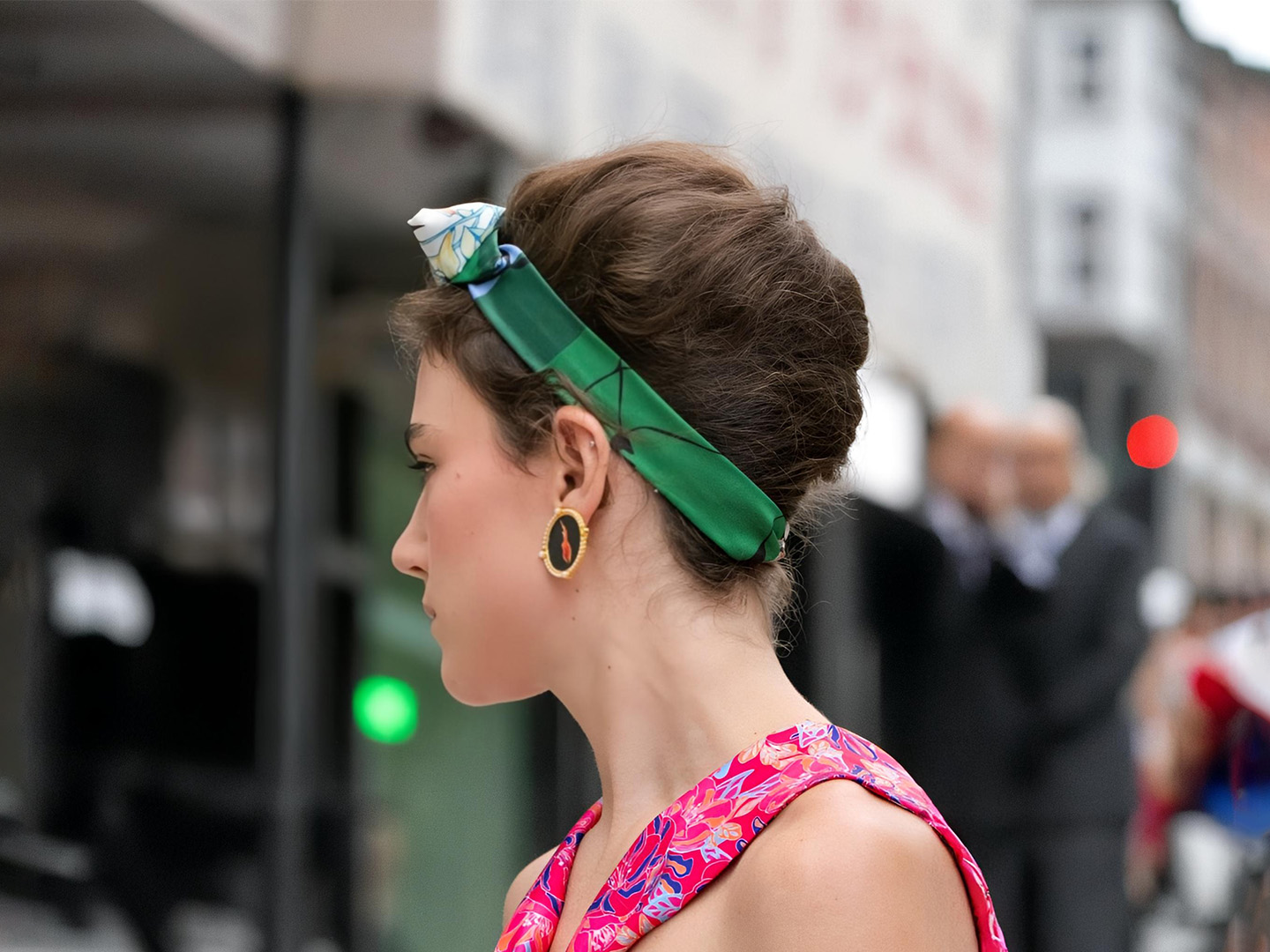 إطلالة مميزة تجمع بين الكلاسيكية والعصرية، حيث يلم الشعر للخلف ويزين بإيشارب ساتان أخضر يتناسق مع الفستان أو الأزياء المختارة، أكسسوار الشعر هنا يضفي طابعاً أنيقاً وبسيطاً، ليكون الشعر جزءاً أساسياً من إطلالاتك في موسم الخريف.