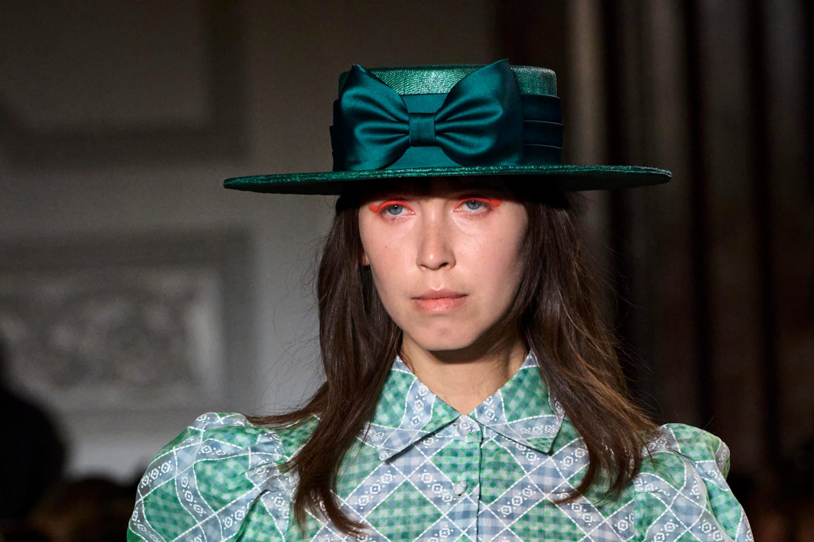 إطلالة مودرن تليق بأجواء النهار أو المساء، حيث يترك الشعر منسدلاً على الأكتاف بحرية مع ارتداء شابوه خضراء يزينها شريط ساتان داكن على شكل فيونكة، الأكسسوار الأخضر يضيف لمسة أنيقة تجعل الإطلالة متناسقة مع المناسبات الرسمية.
