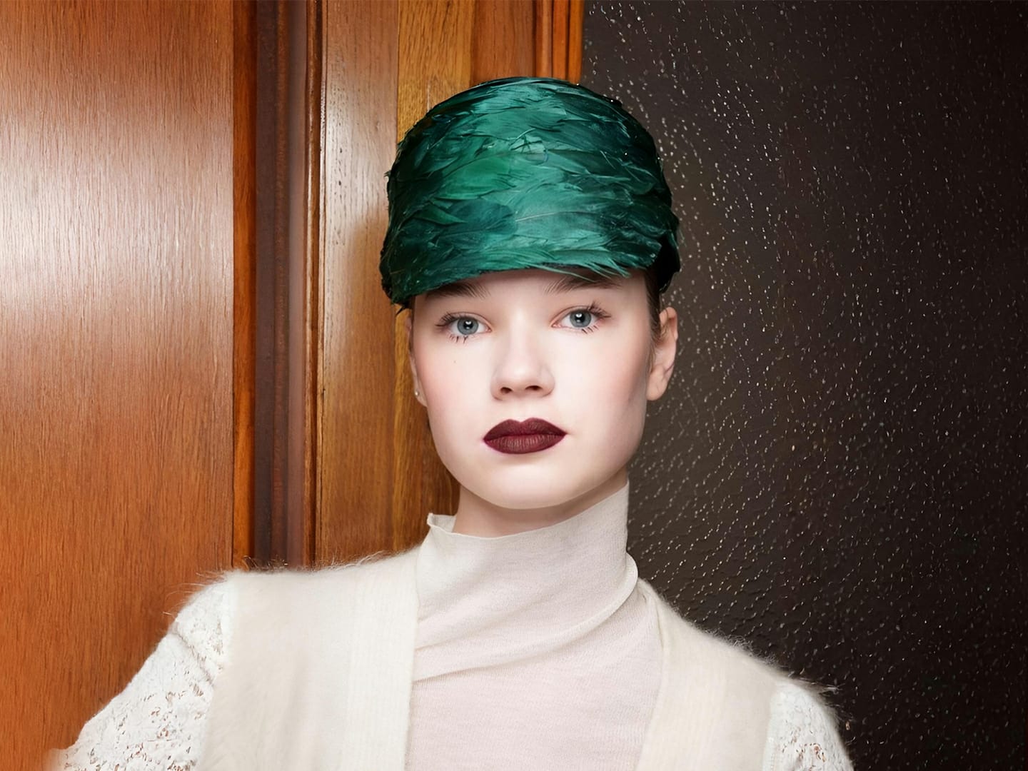 شعر ملموم إلى الخلف مع قبعة صغيرة مزينة بالريش الأخضر
