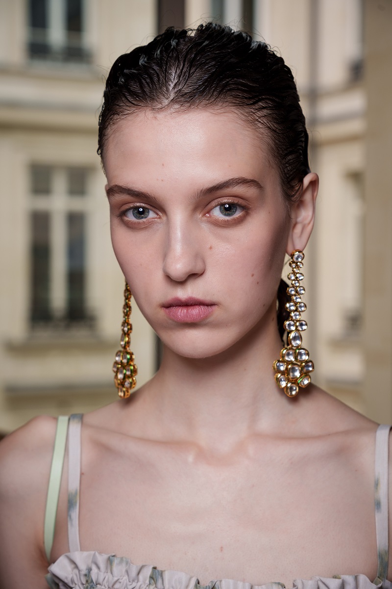 لمسة عصرية جذابة، حملها عرض دار جيامباتيستا فاللي Giambattista Valli في أسبوع الموضة بباريس لربيع وصيف 2026، حيث تميّزت العارضات بإطلالة جمالية ارتكزت على المكياج الناعم وتسريحة الشعر المبللة المسحوبة إلى الخلف. فقد بدت البشرة صافية ومتوهجة بخطوط ناعمة تكشف عن ملامح أنثوية طبيعية من دون تكلف، فيما جاءت الشفاه بلون حيادي بسيط يعكس رقي الإطلالة. أما تسريحة الشعر فأتت مبللة مسحوبة إلى الخلف.