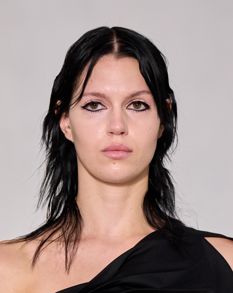 صيحة الأيلاينر الأسود، فرضت حضورها في عرض دار موسي Mossi خلال أسبوع الموضة في باريس لربيع وصيف 2026. فقد تزينت العيون بخطوط أيلاينر سوداء بارزة وممتدة بدقة، لتمنح العينين نظرة حادة ودرامية تحمل الكثير من القوة والجرأة، بينما أتت البشرة طبيعية بخطوط ناعمة وأساس خفيف، ما أتاح للأيلاينر أن يظل محور التركيز الأساسي ويزيد الإطلالة توازناً بين النعومة والحدة. أما الشعر، فجاء بتسريحة مبللة مسرّحة إلى الخلف مع طبقات خفيفة منسدلة، لتمنح الوجه إطاراً عصرياً يضاعف من تأثير مكياج العيون.