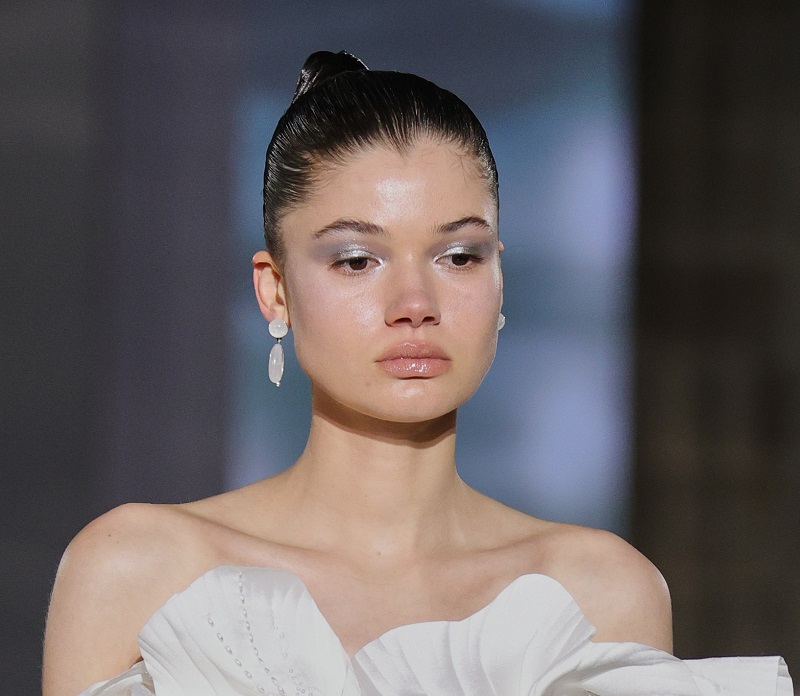 من أبرز صيحات مكياج العروس التي فرضت حضورها على منصات أسابيع الموضة لربيع وصيف 2026، ظلال العيون الغليتر، التي أضافت للعروس بريقاً أخّاذاً يليق بليلة العمر. الألوان المعدنية البراقة بتدرجات الفضي ارتقت بالمكياج إلى مستوى من الفخامة العصرية؛ لتمنح العروس نظرة إشراقة ساحرة تحت الأضواء. ومع تنسيق هذه الظلال اللامعة مع بشرة متوهجة وشفاه طبيعية بلمسة ناعمة، تصبح الإطلالة متوازنة تجمع بين التوهج والنعومة. هذه الصيحة تمنح العروس فرصة مثالية لإضفاء لمسة عصرية متلألئة تجعلها مركز الأناقة والأنظار في يومها الكبير.