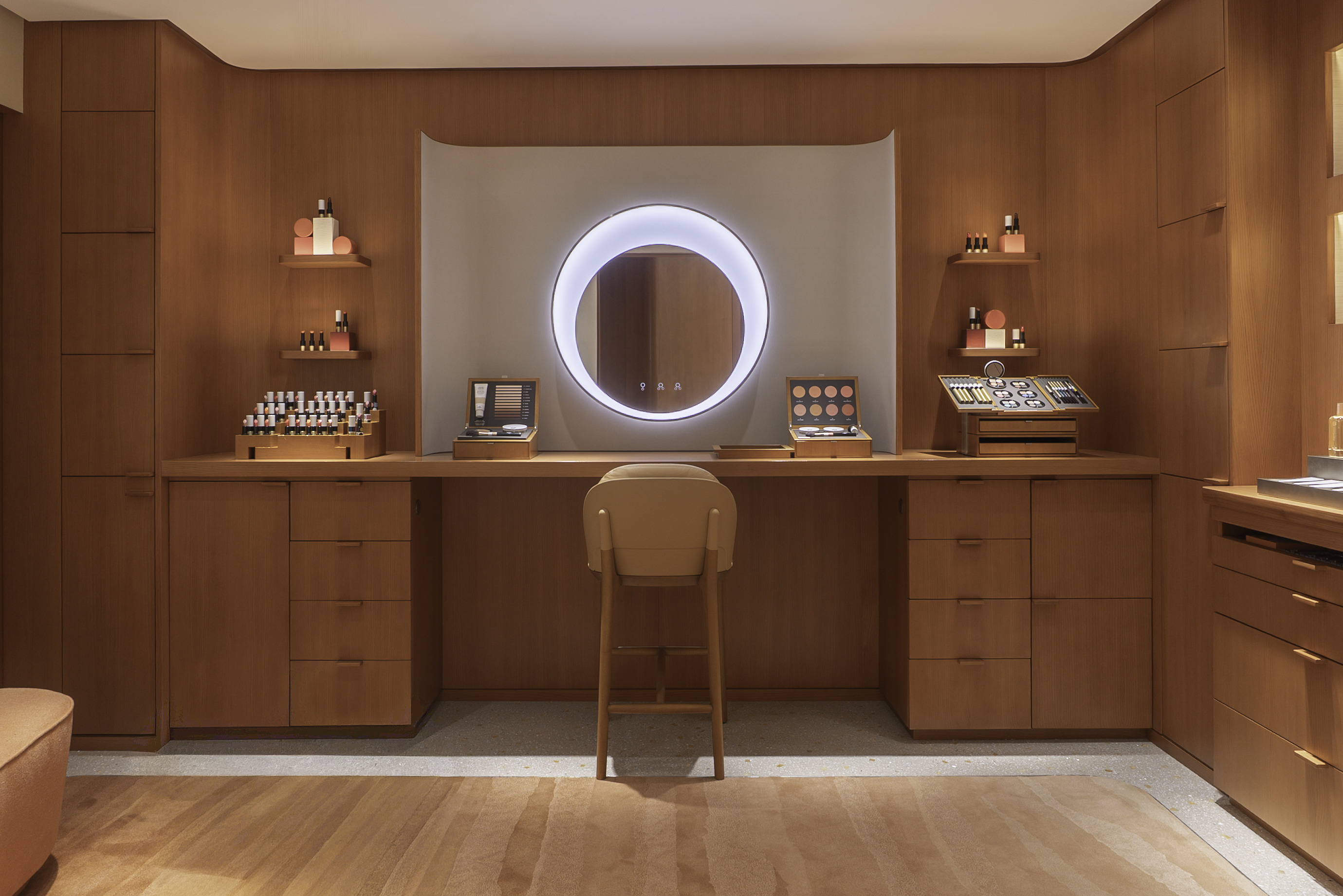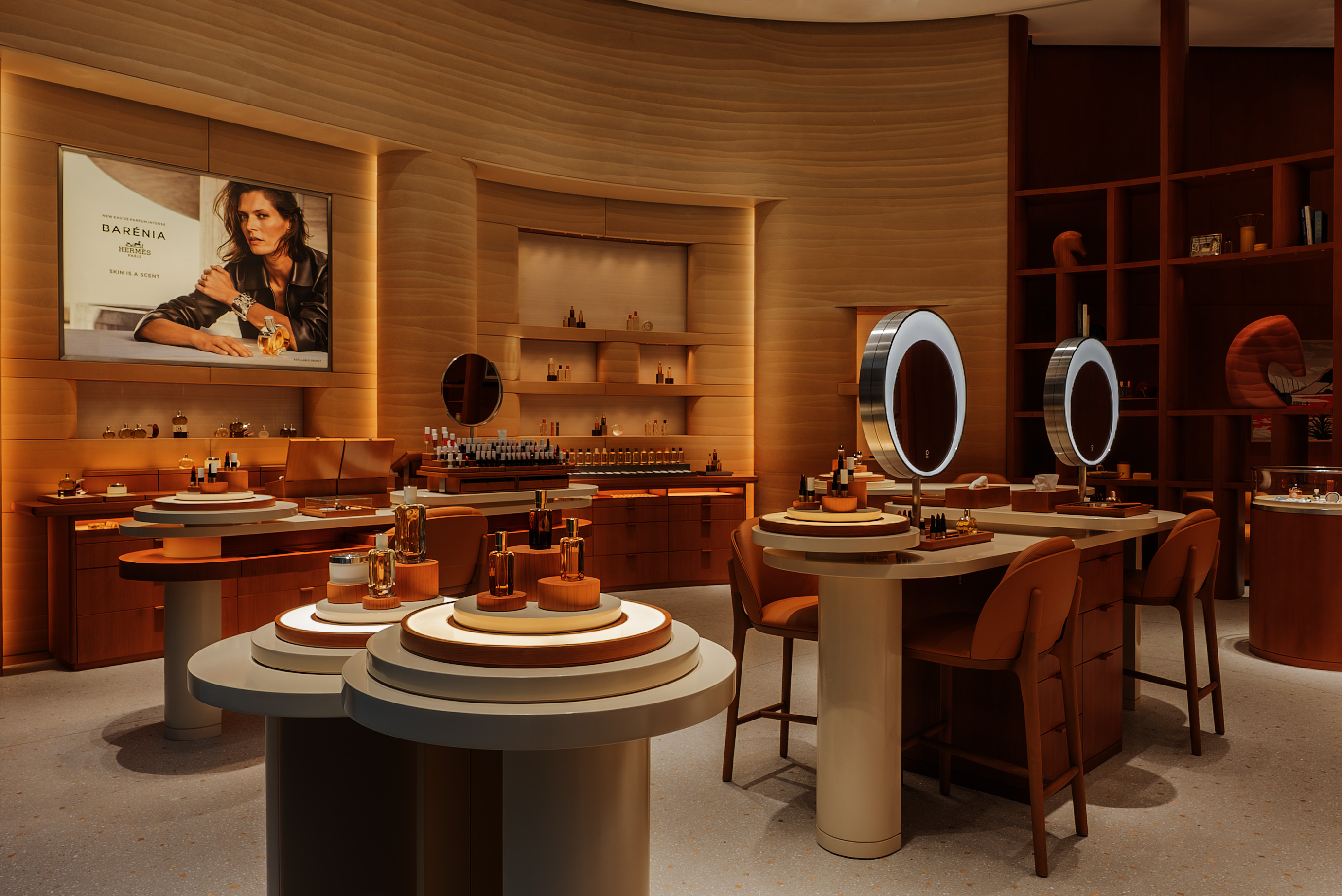 تنساب الخطوط العضوية إلى الداخل، جاذبةً الزائرين نحو مساحةٍ منحنيةٍ مضيئةٍ بدرجاتٍ لونيةٍ أفتح. ويظهر الفسيفساء المميز من متجر 24 شارع فوبور سانت أونوريه في باريس،تتخّّللهــا لمســات مـن الصـدف اللؤلــؤي الّّلمــاع الــذي يعيــد إلــى الأذهــان بريــق ميـاه الخليــج. وتــزدان الخزائــن بالحريــر الناعــم، وتســّّلط علــى حرف العطــور وأغــراض الجمــال أضــواء آســرة.