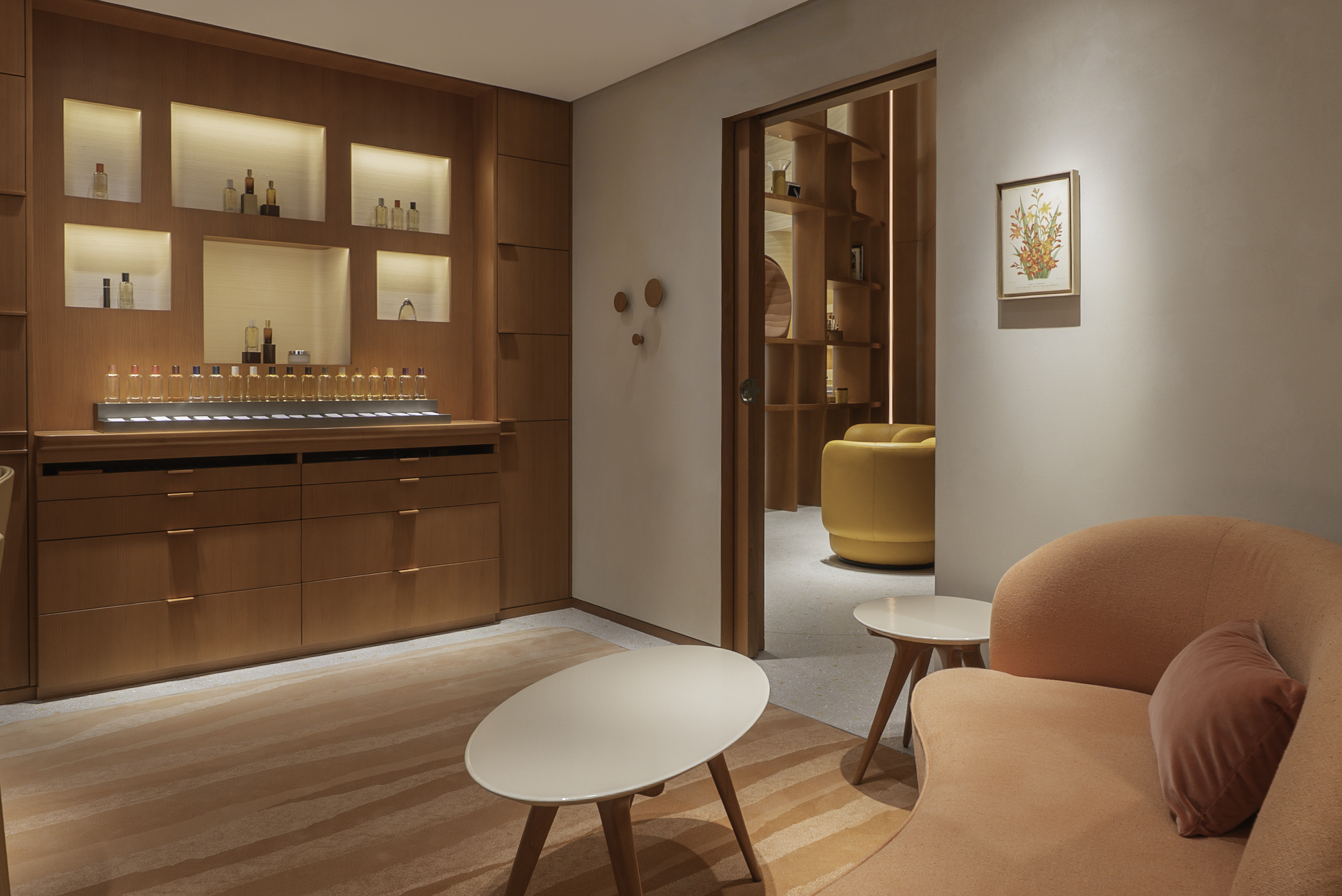 وخلف الخزائن المصنوعة من خشب الأرز بلون العسل، تنتظر الزائرين غرفتان خاصتان لكبار العملاء، تتيحـان تجربـًةً خاصـًةً وشـخصيًةً فـي عالـم Hermès. يمنح السجاد اليدوي المنسوج بألوان الصحراء والأرائك العميقة وطاولات التجميل الأنيقة إحساسًا بالخصوصية، بينما يستمتع الزائرون بتجربةٍ شخصيةٍ لاكتشاف العطور واستكشاف كامل مجموعة هيرميس Hermès للجمال.