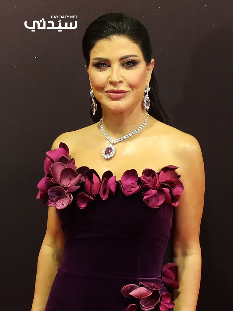 غادة عبد الرازق بمكياج عيون فضي وتسريحة الكعكة العالية