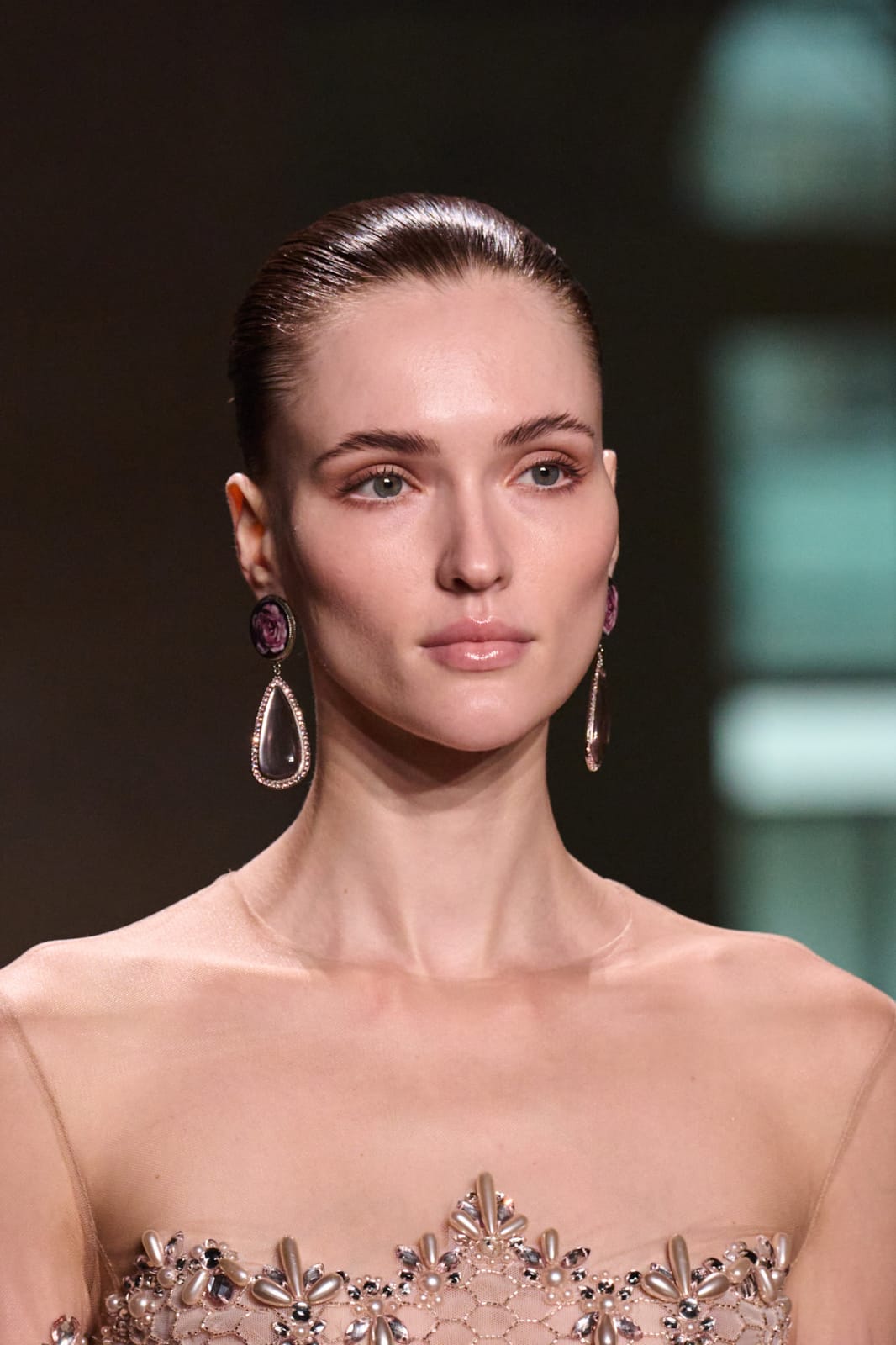 الفستان الفضي يعكس أناقة عصرية ولمعاناً بارداً يخطف الأنظار، لذلك يحتاج إلى مكياج يترجم هذا البريق بأسلوب ناعم ومتوازن. البشرة هي الأساس هنا؛ يفضل أن تكون صافية ومضيئة بلمسة لؤلؤية خفيفة تعكس الضوء دون مبالغة، فتمنح الوجه إشراقاً راقياً ينسجم مع طابع اللون الفضي. العيون تبرز بشكل جميل مع ظلال باردة وناعمة مثل الرمادي الفاتح، الفضي الخافت، أو لمسة موف رمادي، مع تحديد دقيق يمنح العينين عمقاً أنيقاً دون قسوة.