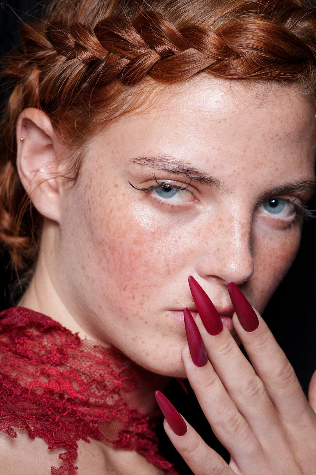 يأتي هذا المناكير الأحمر المات بدرجته المخملية العميقة؛ ليمنح الأظافر حضوراً قوياً يليق بأجواء يوم الحب. الشكل الطويل الحاد يضيف لمسة درامية تعكس ثقة عالية وشخصية جريئة. التباين بين البشرة الطبيعية والنغمة الداكنة للمناكير يصنع جاذبية لافتة دون أي مبالغة. اختياره مثالي إذا كنتِ تبحثين عن لوك كلاسيكي لكن بلمسة عصرية لافتة. ومع الإطلالة الهادئة للوجه، يبرز لون طلاء الأظافر كالعنصر الأكثر سحراً في المشهد كله.
