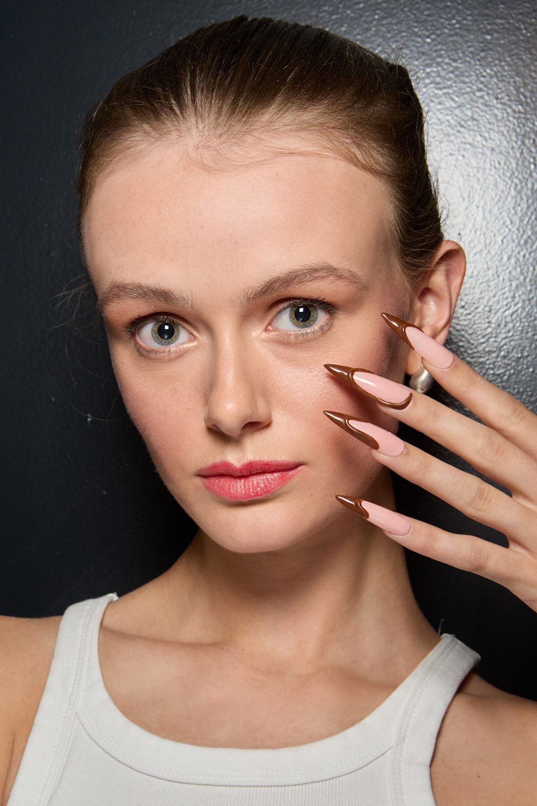 يمنح هذا الستايل مزيجاً متناغماً بين الوردي الفاتح الناعم والأطراف البنية الغنية؛ ليخلق تبايناً أنثوياً جذاباً يناسب يوم الحب. الشكل الطويل الحاد يعزز فخامة التصميم، ويمنحه حضوراً قوياً دون أن يفقد رقته. اللون الوردي يضفي لمسة هادئة وعذبة، بينما يضيف البني عمقاً ورومانسية لافتة. هذا الأسلوب يناسبك إذا كنت تبحثين عن أظافر تجمع بين الدفء والرقة في الوقت نفسه. والنتيجة إطلالة متكاملة تجعل اليدين محوراً للجاذبية والرومانسية.