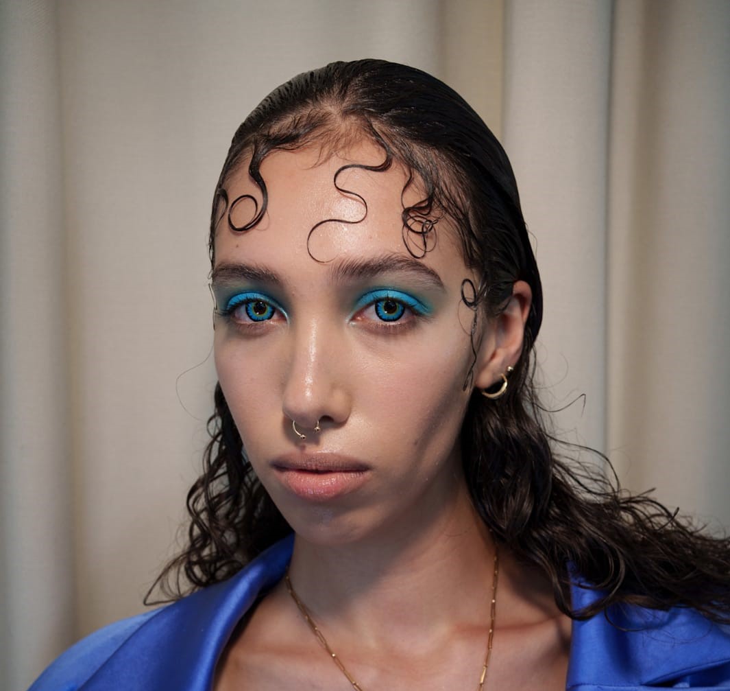 هنا تظهر الظلال الزرقاء بدرجة أكثر كثافة ووضوح، حيث تغطي الجفن بالكامل مع دمجها عند الأطراف للحصول على تدرج ناعم. تم تنسيقها مع تحديد خفيف جداً للعين، ما جعل الظلال هي العنصر الأساسي في الإطلالة. هذا الامتزاج يمنح العين عمقاً وجاذبية، ويعكس أسلوباً عصرياً جريئاً دون الحاجة إلى خطوط كحل حادة.