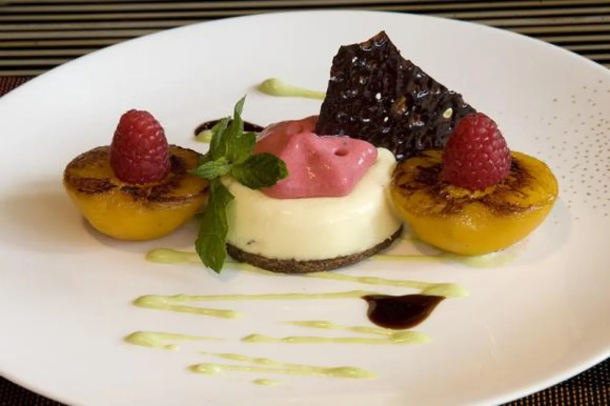 5- لتحضير الخوخ: يغلى الماء مع السكر والزنجبيل، ثم يوضع فيه الخوخ، ويدع على النار حتى يصبح طرياً. وتضاف رغوة التوت للبارفيه، ويقدّم الخوخ بجانبها.