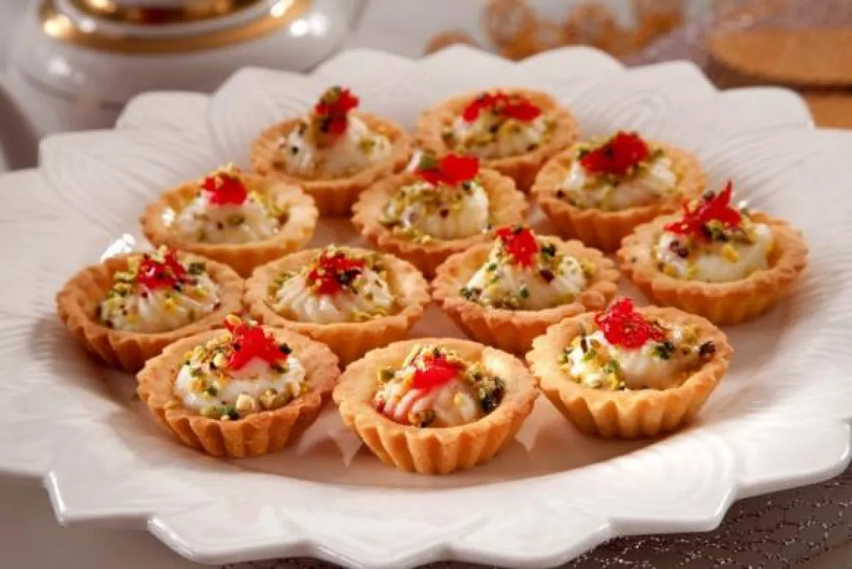 8- ضعي «التارت» في طبق تقديم واسع. ضعي في كل «تارت» بعض القشدة والعسل، ثم زينيها بمربى الزهر والفستق.