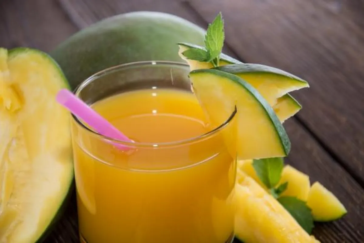 3- يقشر الخوخ ويقطع، ويضاف مع المانغو والحليب السائل إلى الخلاط الكهربائي، حتى يتشكل خليط ناعم يسكب في أكواب التقديم، يعلوه عصير البرتقال والليمون.