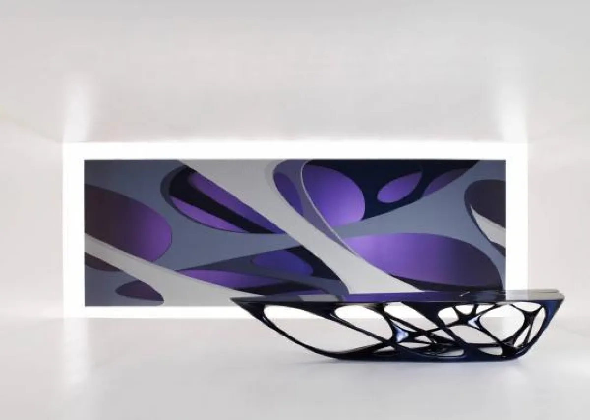 ـ Moon System كنبة باللون البنفسجيّ الداكن مستوحاة من شكل القمر، أضيفت إليها طاولة بذات اللون والشكل.