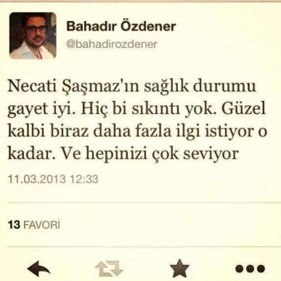 وأكد صديقه الكاتب بهادر أوزدنير تحسّن حالته من خلال حسابه الشخصي على موقع التواصل الإجتماعي "تويتر"، حيث كتب "نجاتي شاشماز بخير، ويتمتع بصحة جيدة، قلبه بخير، ولا يعاني من أية مشاكل، وهو يحبكم جميعاً".