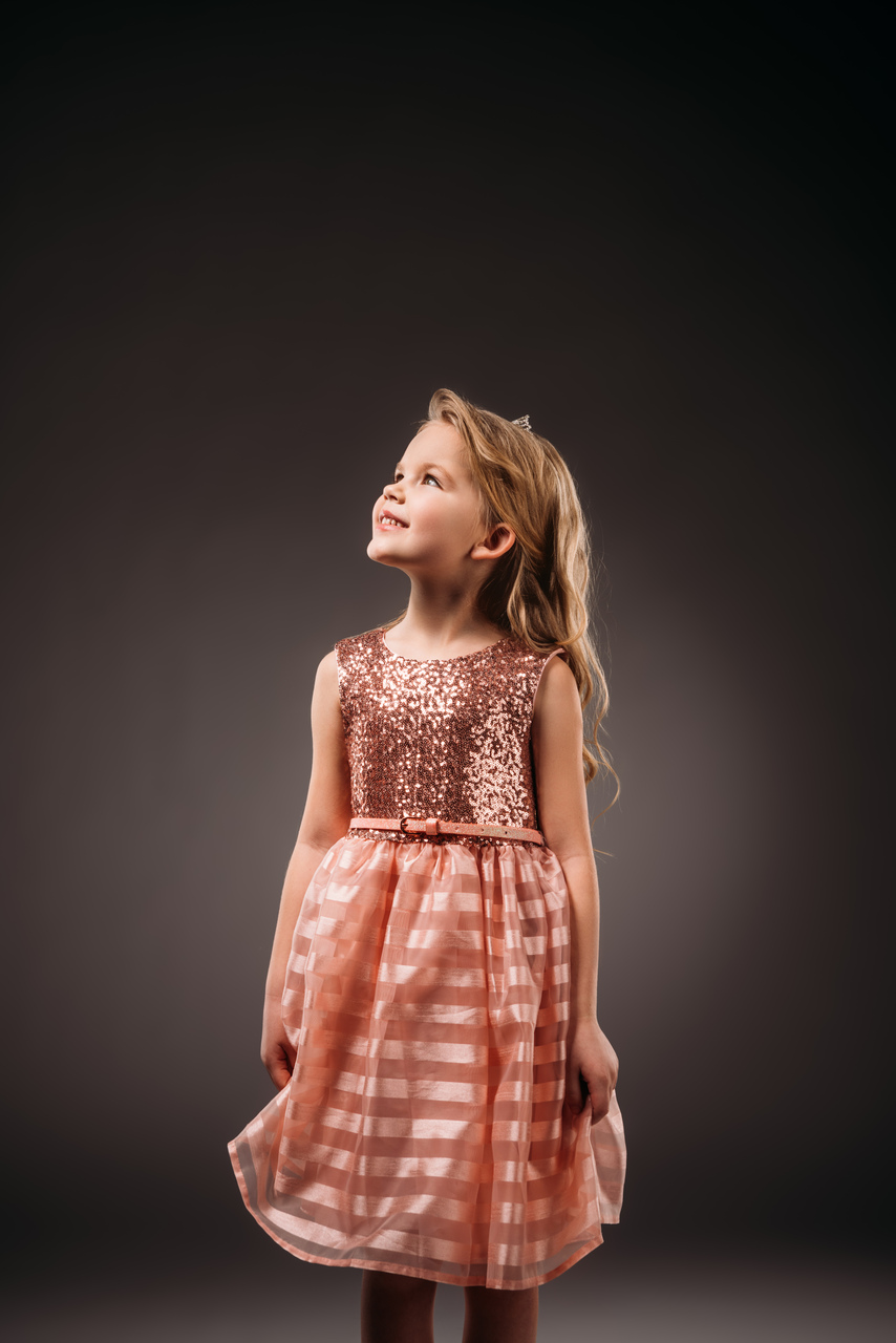 الجزء العلوي، من الفستان مصنوع من قماش الترتر اللامع باللون الوردي الذهبي، يعطي لمعة جميلة تعكس الضوء بطريقة جذابة دون مبالغة، مما يضفي لمسة احتفالية تناسب المناسبات الخاصة. أما الجزء السفلي: مصنوع من قماش ناعم وخفيف مثل الشيفون أو التول المبطن، بطبعة مربعات وردية وبيضاء تضيف روحًا طفولية مرحة إلى التصميم.