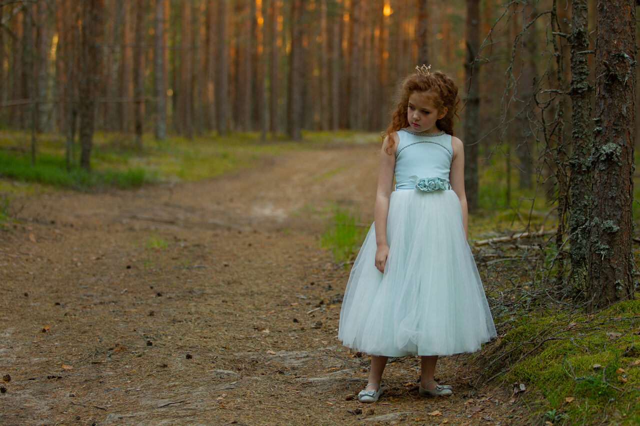 الفستان باللون الأزرق الأفتح، السماوي، مصنوع من قماش التول الخفيف الذي يمنحه مظهرًا رقيقًا ومثاليًا للأعمار الصغيرة، مع تداخل من قماش الساتان الناعم في الجزء العلوي ليعطي لمسة أنيقة. ويناسب الفتيات اللواتي تجاوزن العاشرة من العمر.