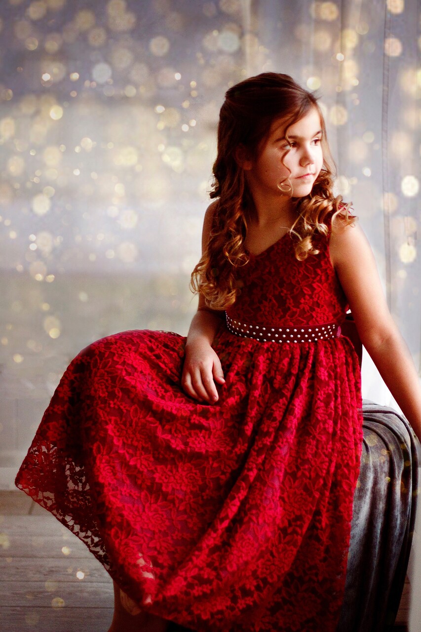 الفستان يناسب تمامًا عمر الفتيات الصغيرات في المناسبات الخاصة مثل الأعياد أو حفلات الميلاد أو الأعراس، إذ يجمع بين الأنوثة والبراءة. تصميمه لا يُظهر ملامح الكبر بل هو طفولي وبريء. و يتحول في الأجواء الرسمية إلى قطعة ملوكية صغيرة. أما القماش الأساسي — دانتيل مطرز بخيوط لامعة بلون أحمر عنّابي فوق بطانة من الحرير أو الساتان اللامع — يمنح الفستان بريقًا راقيًا تحت الأضواء.