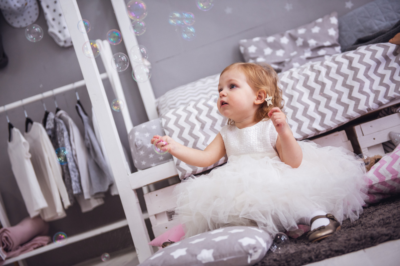 وبين تنورة من طبقات التول البيضاء التي تضيف حجمًا وأناقة طفولية مرحة. أما من الأعلى، فقد يكون منسوجاً يدوياً من خيطان الدي إم سي، يكون التصميم مناسبًا تمامًا لعمر الطفلة، إذ يجمع بين البساطة والنعومة دون مبالغة في التفاصيل، ما يمنحها حرية الحركة مع لمسة من الأناقة. وفضفاض قليلاً عن الوسط، من دون حزام حتى لا يضايق حركة الفتاة الصغيرة في يوم ميلادها الأول.