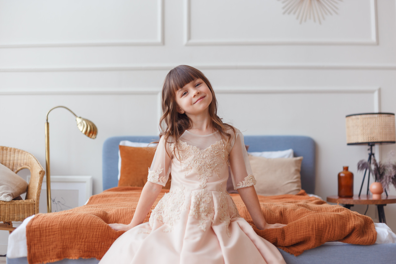 يُفضل أن يكون الخصر محددًا بشريط حريري أو حزام رفيع بلون ذهبي أو بنفس لون الفستان مع عقدة صغيرة على الجانب لتضيف لمسة طفولية أنيقة.