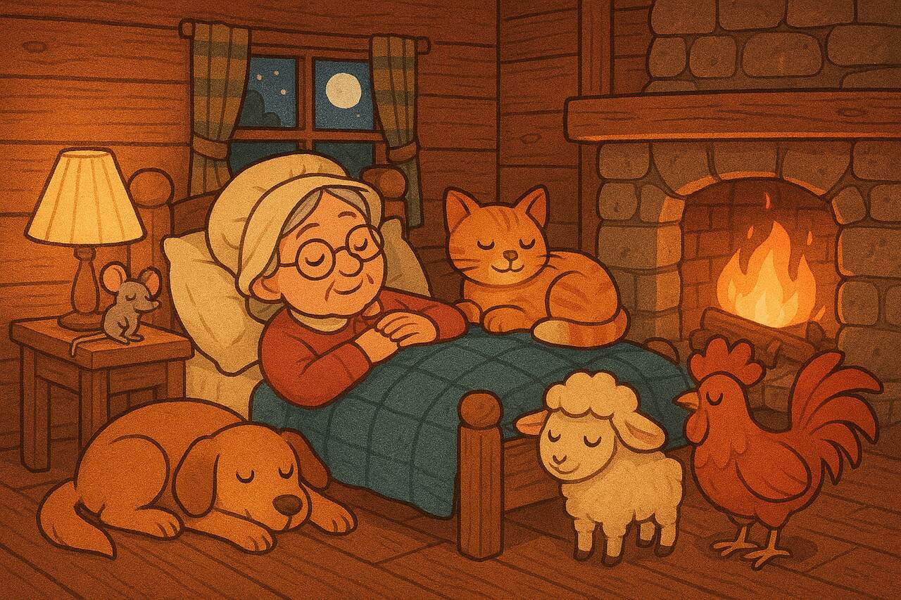 داخل بيت القيلولة، كان هناك برجٌ ظريفٌ من المخلوقات النائمة: الجدة، والبرغوث، والكلب، والقط، والفأر، والخروف الصغير، والديك. كلٌّ منها كان يُصدر أصواته النائمة، مُصدراً ضجيجاً هادئاً.