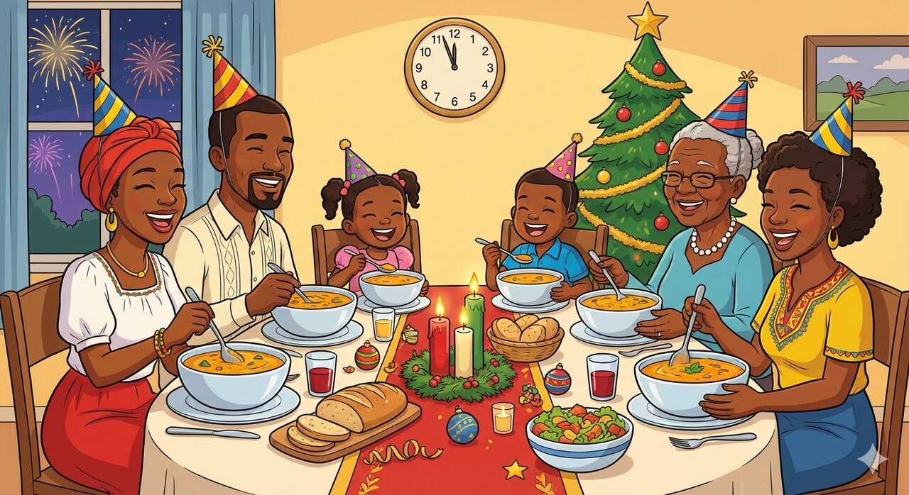 في كل يوم رأس سنة، منذ صغرهما، كان جونيور وروزيلين يستيقظان باكراً ويشاركان والديهما وجديهما في تحضير حساء القرع. كان هذا تقليدهما المفضل، وكانا ينتظرانه بشوق طوال العام. كان الحساء صحياً ولذيذاً، غنياً بالبطاطا والقرع واللحم ومكونات شهية أخرى. وكان تحضيره يستغرق وقتاً طويلاً، لكن هذه المرة كان الوقت مليئاً بالفرح والضحك بينما كان الجميع يعملون بنشاط في المطبخ.