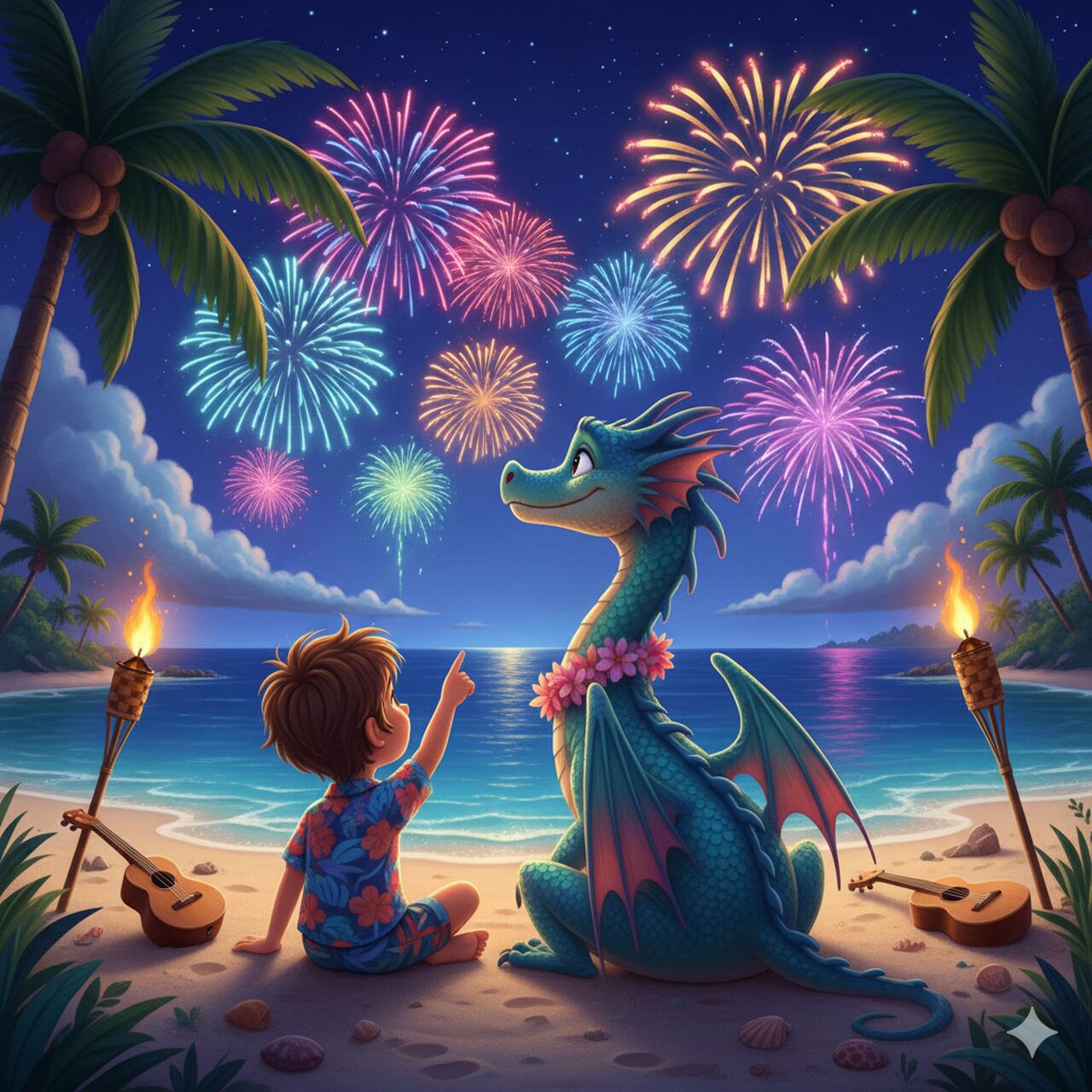 مع غروب الشمس فوق جزيرة كيريباتي الصغيرة، لم يستطع الشاب باورو كبح جماح حماسه. لم يتبق سوى ساعات قليلة على ليلة رأس السنة، وكان يعد الأيام حتى يتمكن من مشاهدة الألعاب النارية مع صديقه المقرب، التنين المسمى بليز.