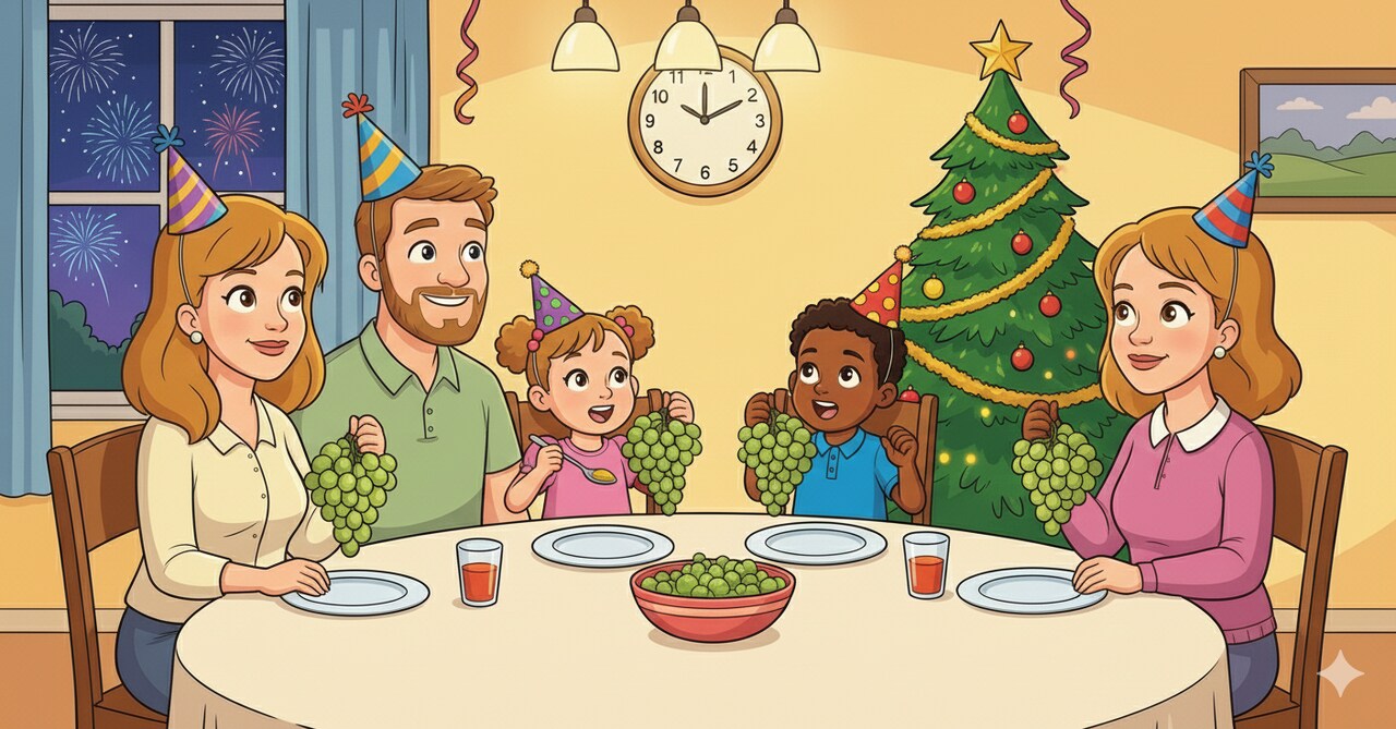أعجب آدم بالتقاليد الإسبانية. فمع كل دقة من دقات جرس منتصف الليل، يأكلون حبة عنب. ويعتقدون أن تناول حبة عنب مع كل دقة يجلب الحظ طوال أشهر السنة الجديدة الاثني عشر.