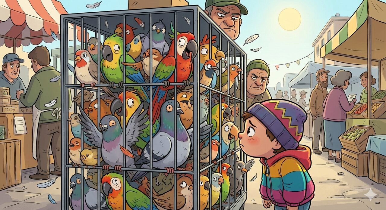 بينما كان جوني يتجول في السوق، لمح في تلك اللحظة متجراً فيه عدد كبير من الطيور المحبوسة في أقفاص. كانت الطيور، التي بينها العصفور والحمام والبببغاء، تضرب مناقيرها على القفص باستمرار في محاولة للهرب، وكان الكثير منها ينزف دماً.