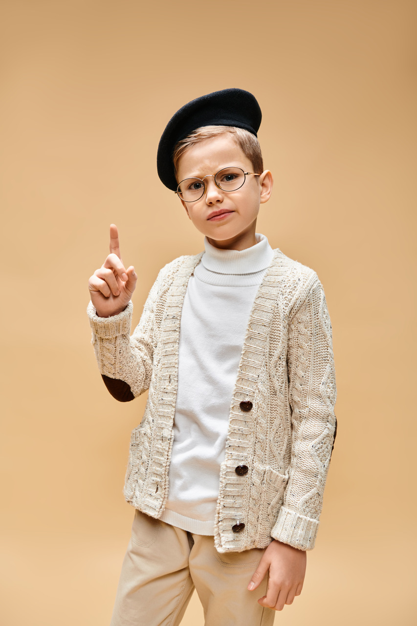طريقة وقوف الطفل في الصورة (رفع الإصبع كأنه يعطي تعليمات أو يصحح معلومة) مع نظرة العين الجادة خلف النظارة، تعزز شخصية "القائد الصغير": هو طفل يعرف ماذا يريد.