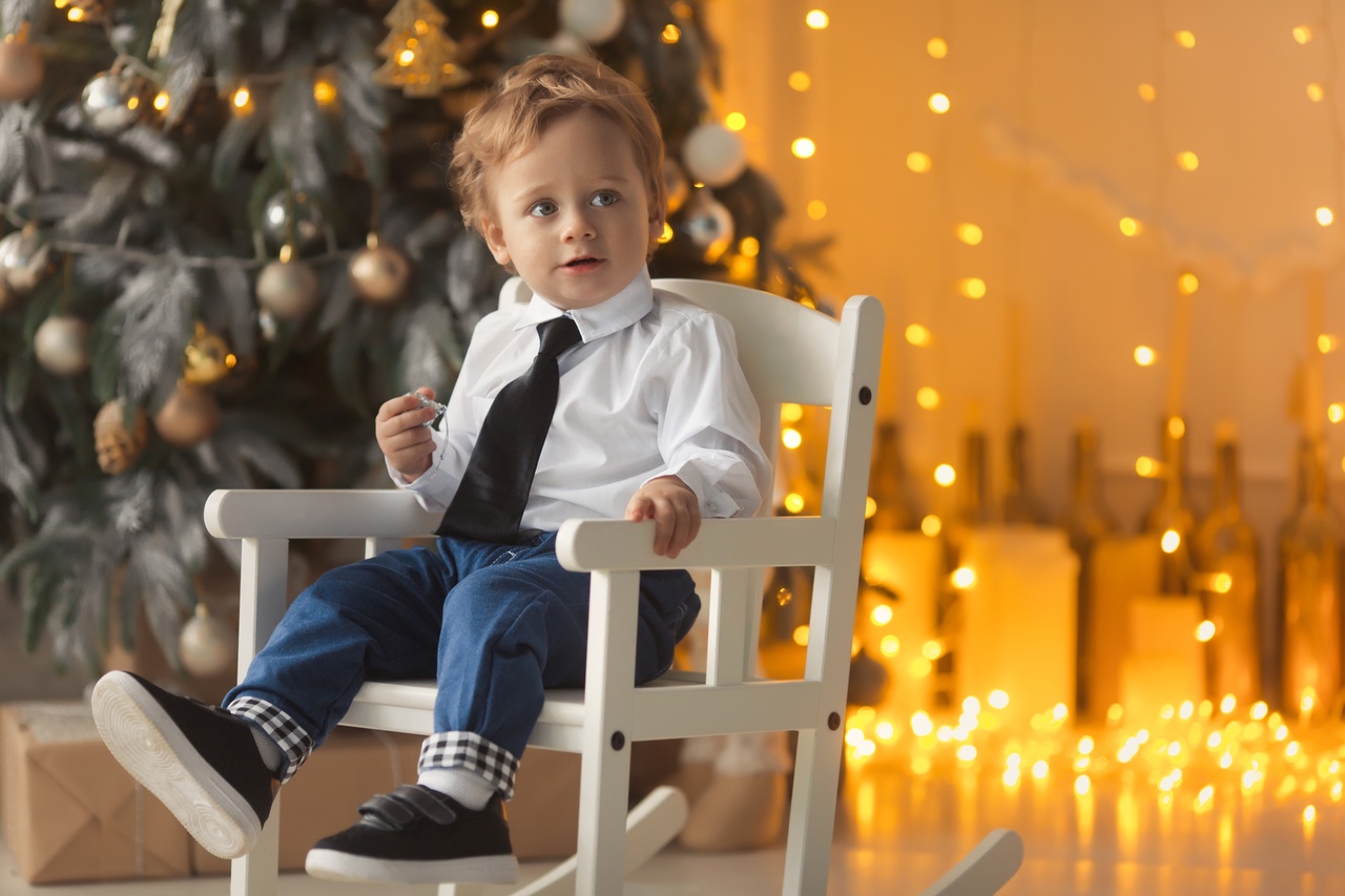 هذا الطفل يرتدي طقماً أنيقاً يجمع بين الطابع الرسمي واللمسة العصرية، وهو تنسيق مثالي للمناسبات والاحتفالات مثل أعياد السنة الجديدة.
