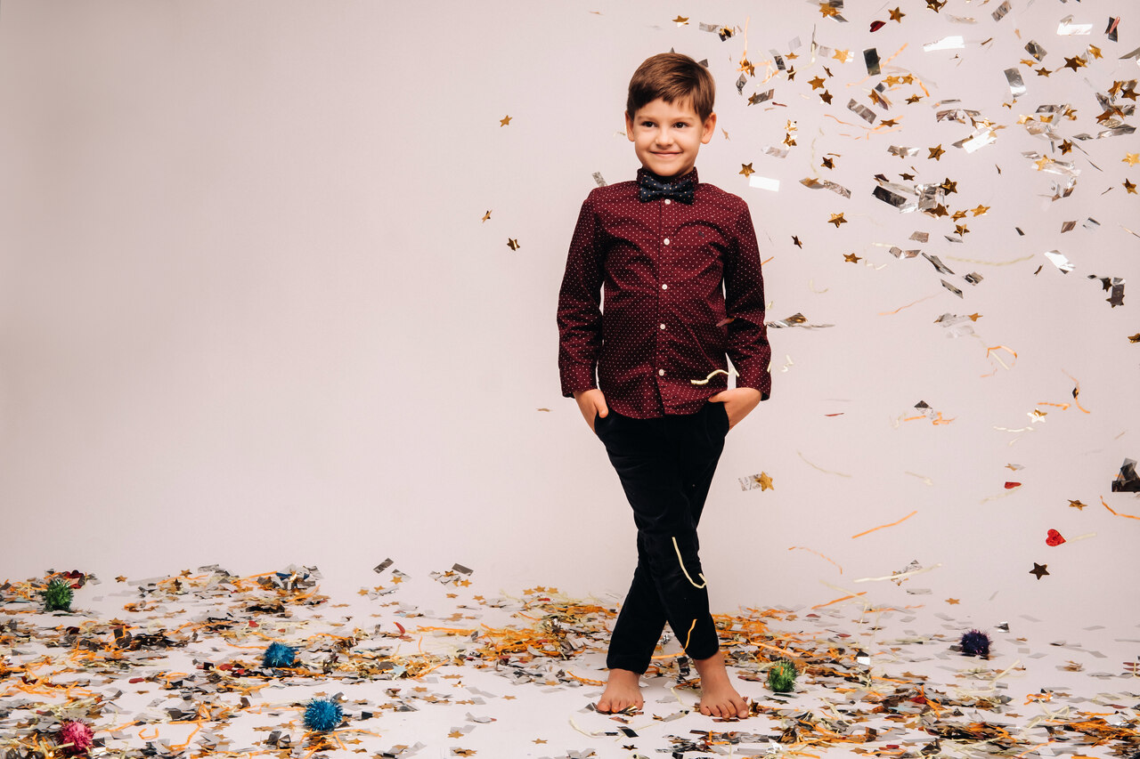 4. ملاحظات إضافية: الطفل يظهر حافي القدمين في الصورة، مما يوحي بأن الصورة التقطت في جلسة تصوير داخل استوديو حيث التركيز يكون على الحركة والعفوية مع وجود القصاصات الملونة.