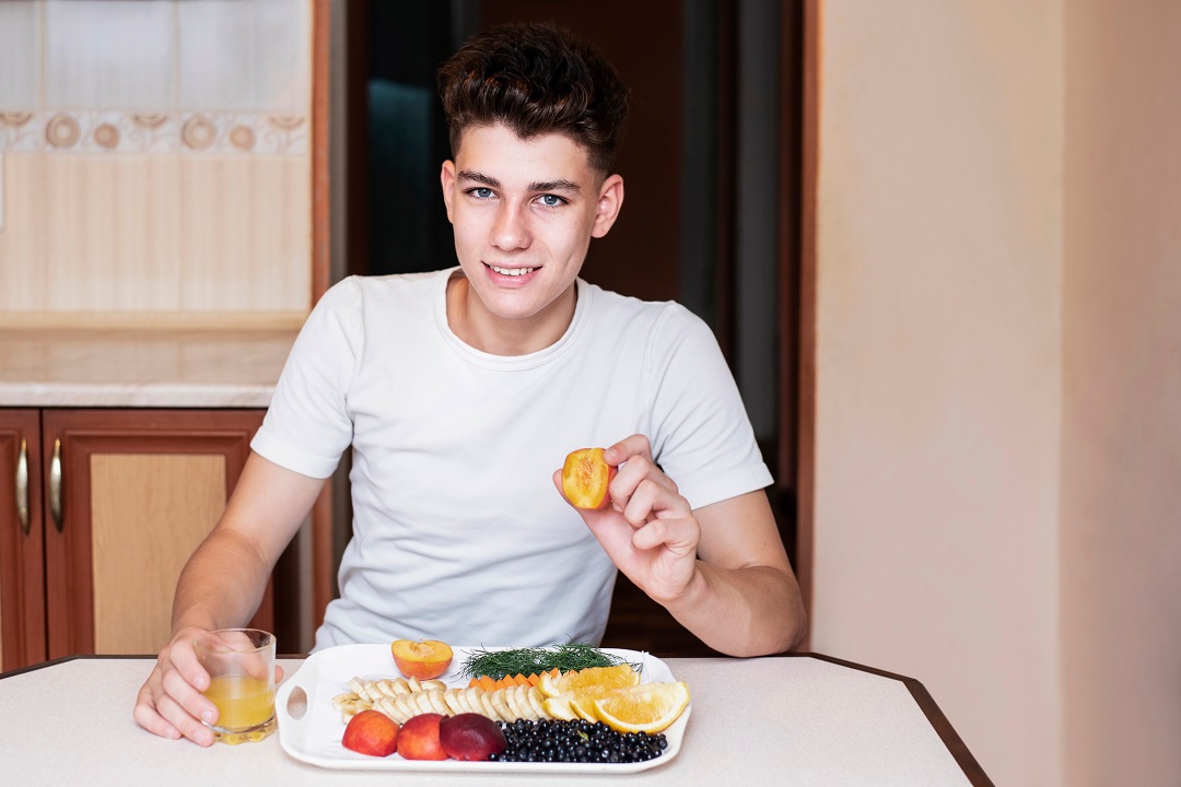 وجبات متنوعة: البروتين، الكربوهيدرات المعقدة (حبوب كاملة)، دهون صحية، وفرة من الفواكه والخضروات الملونة، تناول الكالسيوم لأهميته في نمو العظام، ويتواجد في (منتجات الألبان).