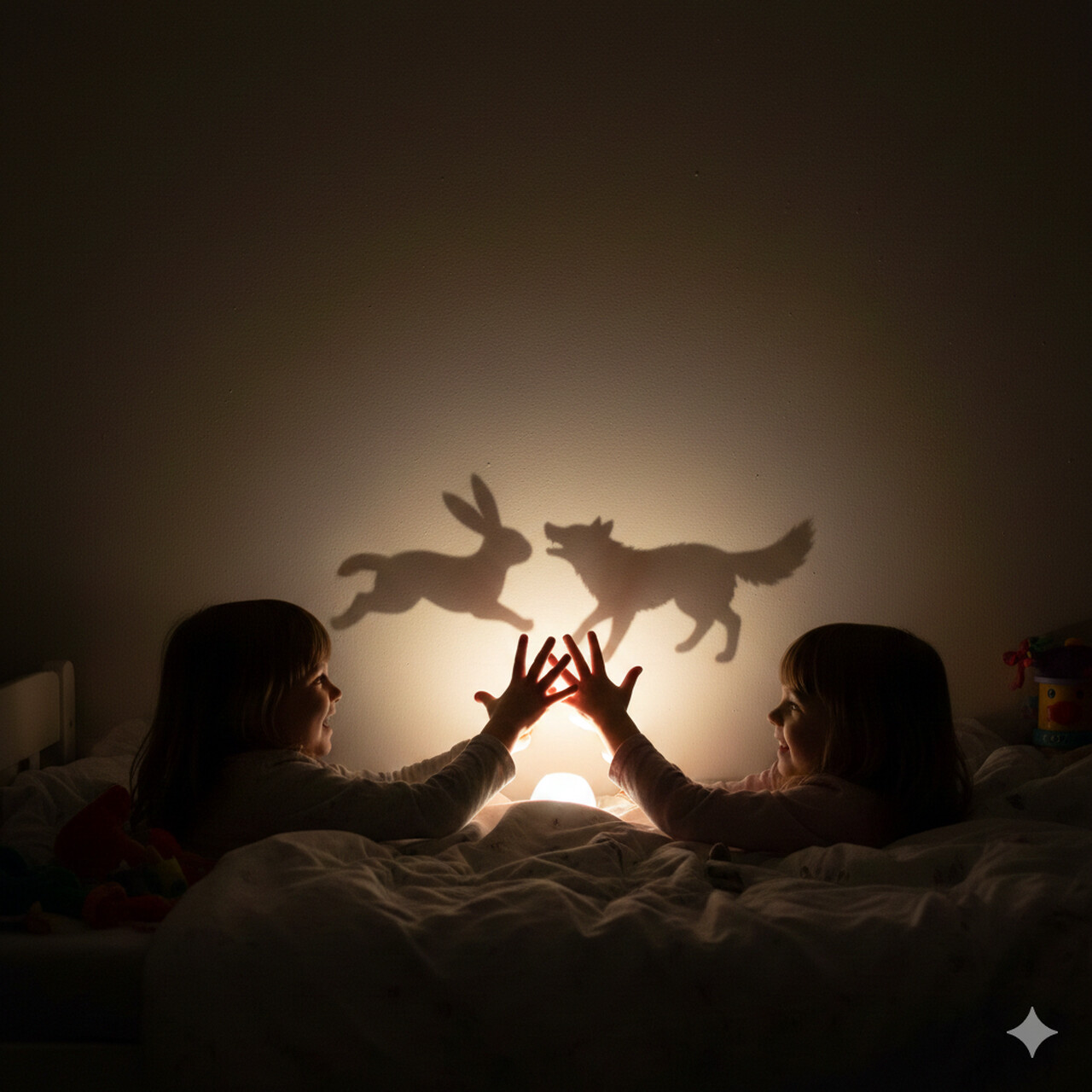 أغلقت فمها بسرعة، وضعت يدها على رأسها، وتساءلت: ماذا أفعل؟ نظرت حولها، فرأت النافذة مفتوحة، والستارة تتحرك، فوقفت، وبدأت تراقب الظلال على الحائط، مدّت يدها وحرّكت أصابعها، حتى أصبح هناك طائر، ثم كلب، ثم أميرة، فأحضرت مصباحاً صغيراً. وأطفأت الأنوار، ونادت أختها قائلة: "تعالي... سأعرض عليك مسرحاً".
