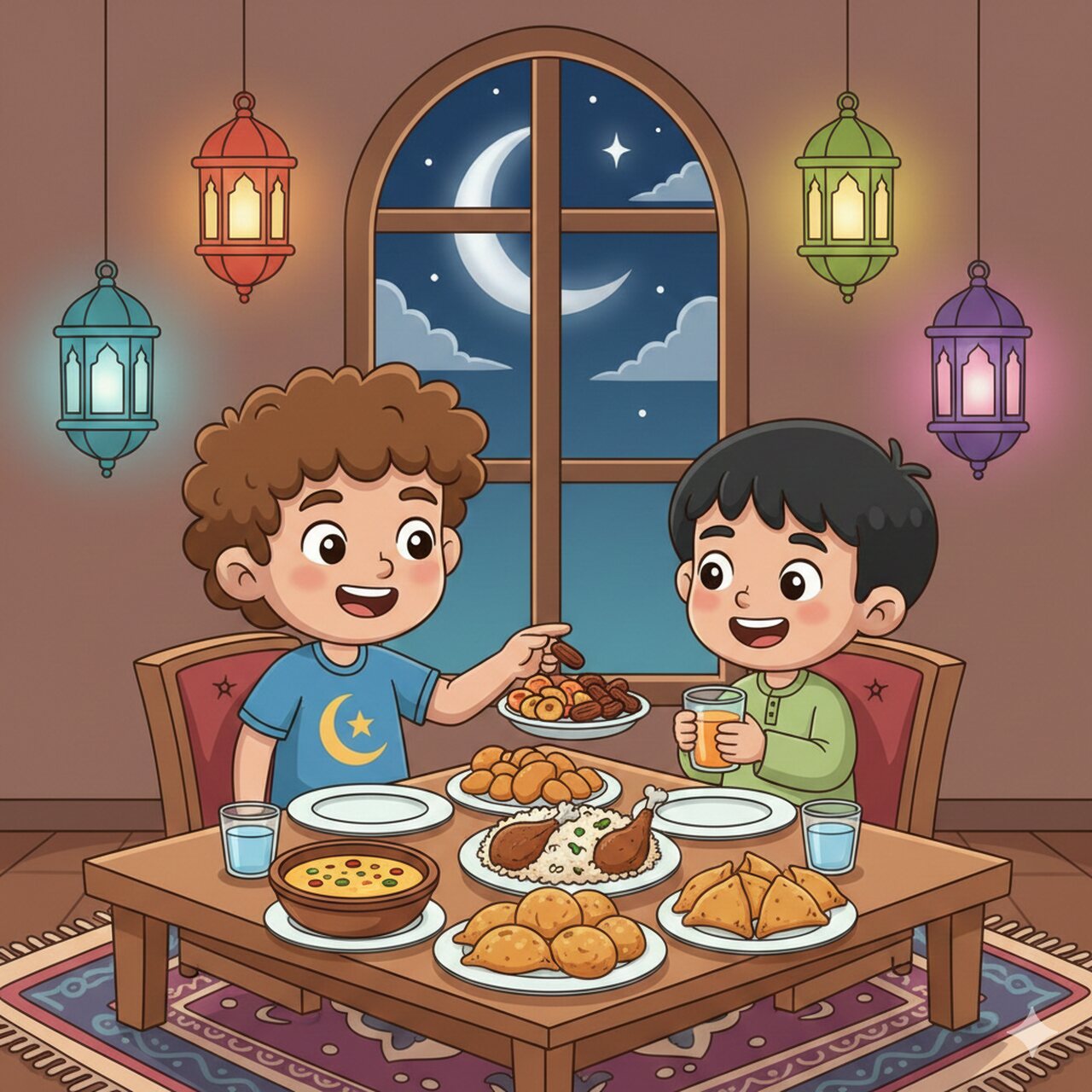 قبل المغرب، جلس الطفل يراقب الساعة، يشعر بسعادة مختلفة. وعندما وصل صديقه، رحّب به بخجل وفرح في الوقت نفسه. جلسا معاً ينتظران الأذان، يتبادلان الحديث عن المدرسة والصيام.