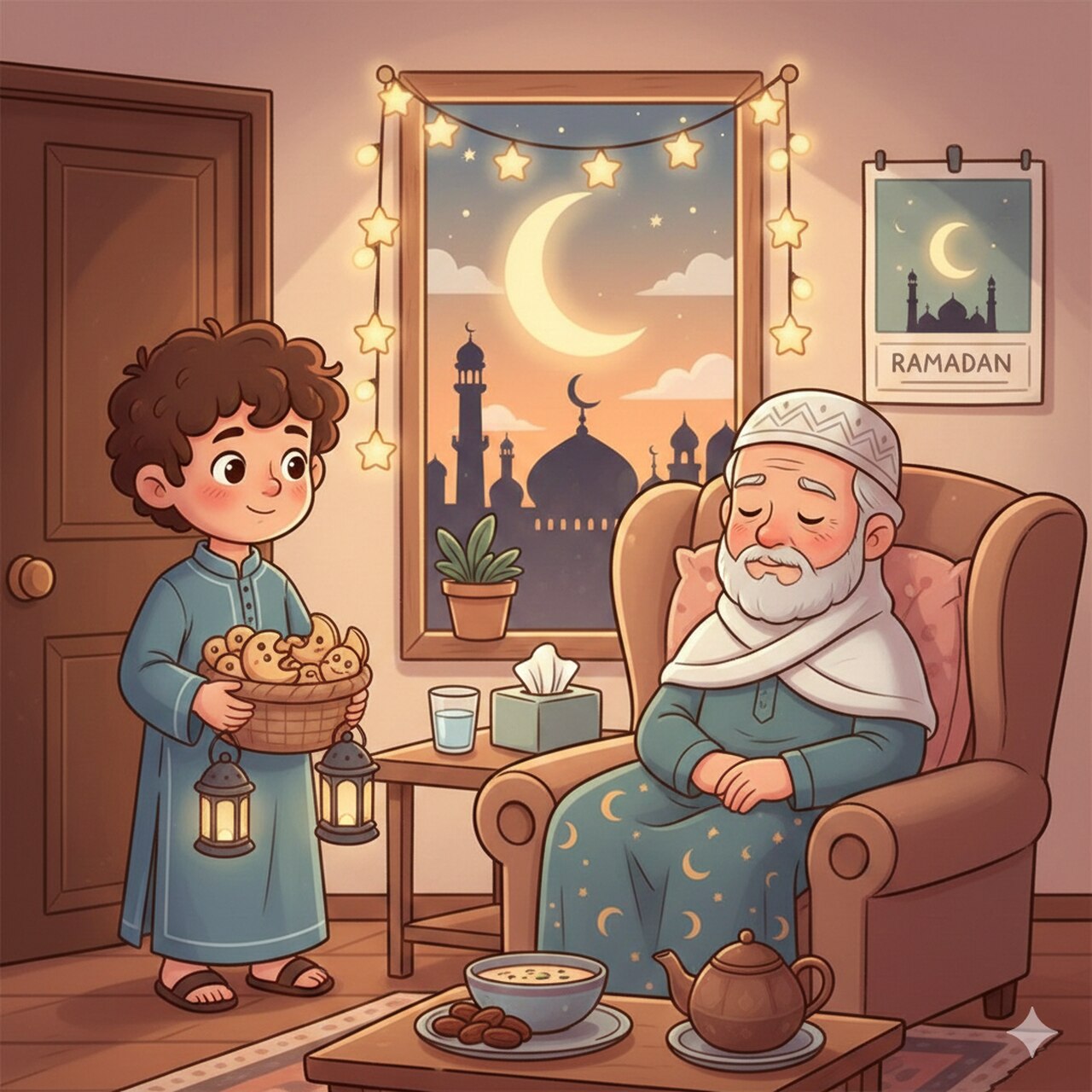 اقترب الطفل منهما بهدوء، قبّل رأسيهما، وجلس بينهما. أحضر لهما الماء، وعدّل الوسادة لجدّته كما رأى أمّه تفعل دائماً. ابتسم الجد وقال: «وجودك اليوم هو أجمل هدية في شهر رمضان».