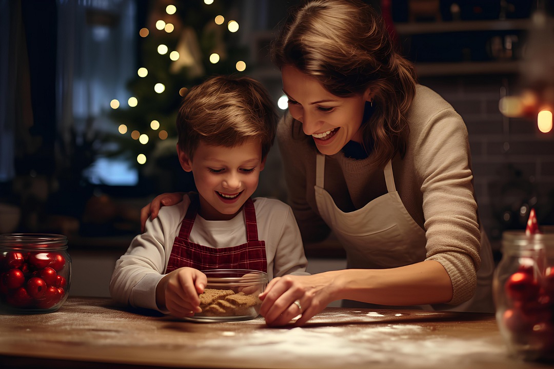 طفل يشارك أمه إعداد الحلوى