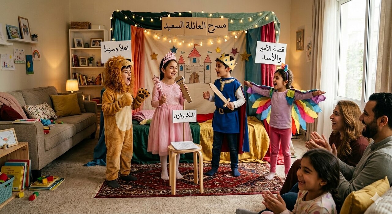 من الأنشطة التربوية الجميلة أيضاً تنظيم "مسرح العيد العائلي"، حيث يمكن للأطفال أن يمثلوا قصة قصيرة أمام أفراد العائلة؛ باستخدام ملابس بسيطة أو قبعات أو دمى، وقد تكون القصة عن طفل يساعد جيرانه أو عن عائلة تحتفل بالعيد، وهنا يتعلم الأطفال مهارات التعبير والتحدث أمام الآخرين، كما ينمو لديهم الخيال والإبداع، ويمكن للوالدين أن يشجعا كل طفل على أداء دور معين، سواء كان ممثلاً أو راوياً للقصة أو مسؤولاً عن تحريك الدمى، فيشعر الجميع أنهم جزء من عرض صغير مليء بالضحك والتصفيق.