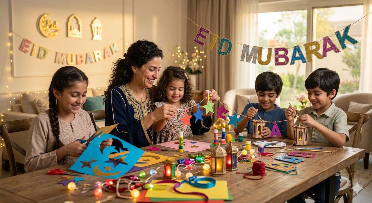 أحد أجمل الأنشطة التي يمكن تنفيذها في المنزل خلال العيد هو نشاط "صناعة زينة العيد"، حيث يمكن تخصيص ركن صغير في غرفة الجلوس أو على طاولة كبيرة يجلس حولها الأطفال، ومعهم أوراق ملونة ومقصات آمنة وغراء وشرائط لامعة، ليبدأوا بصناعة زينة خاصة بهم، يعلقونها في البيت، مثل الهلال والنجوم أو بطاقات التهنئة أو سلاسل ورقية ملونة، وخلال هذا النشاط لا يتعلم الطفل فقط مهارة العمل اليدوي، بل يعيش أيضاً تجربة المشاركة والشعور بالإنجاز؛ حين يرى البيت يتزين بأعمال صنعها بيديه، كما يمكن للوالدين استغلال هذه اللحظة للحديث مع الأطفال عن معنى العيد، ولماذا يحتفل الناس به، فيتحول النشاط الفني إلى لحظة تربوية دافئة مليئة بالحوار.
