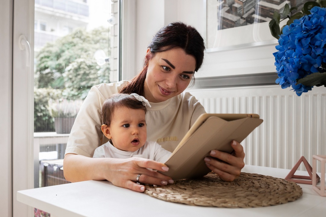 - من 6 – 12 شهراً: يبدأ الطفل بالتركيز على الصور، تجدينه يلمس الكتب ويقلب صفحاتها عند جلوسه وحده، هنا يُفضل استخدام كتب القماش أو الكرتون الصلب في البداية.