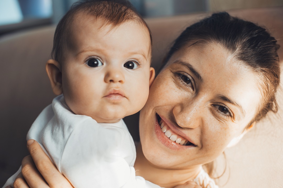 أم تبتسم وهي تحمل طفلها