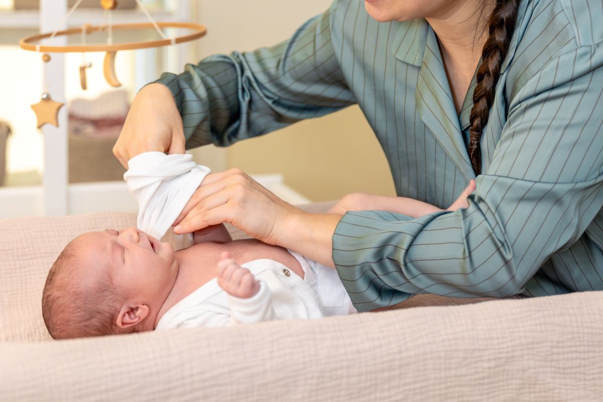 7- لا تختاري الملابس المصنوعة من الفرو بعد الاستحمام؛ لأنها تحبس حرارة جسم الطفل، وهو يكون بحاجة إلى استعادة حرارة جسمه الطبيعية، مما يزيد من تعرقه وتعرضه للجفاف، ولذلك اختاري له ملابس قطنية ناعمة وسهلة الفك والخلع؛ لكي تسهل عليك خطوة تغيير الحفاض، فلا تضطري لنزع كل الملابس.