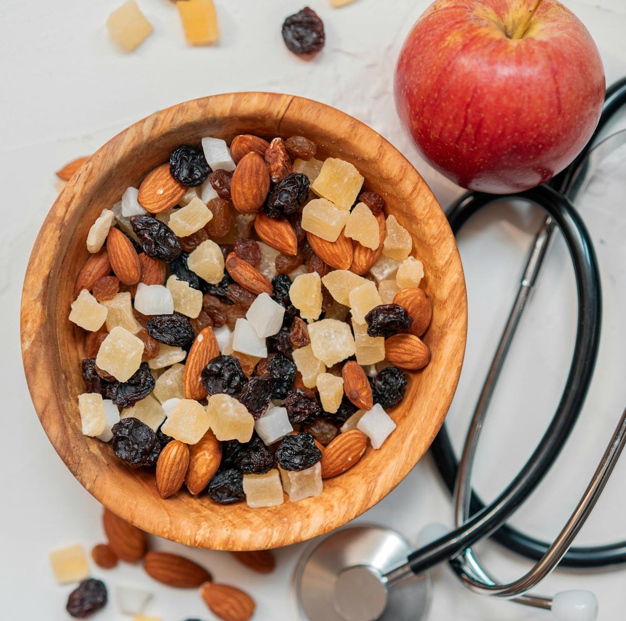 - مصدر مركّز للطاقة: الفواكه المجففة هي فواكه طازجة تم تجفيفها باستخدام عمليات طبيعية أو ميكانيكية. يؤدي هذا التجفيف إلى تركيز العناصر الغذائية والسكريات، مما يجعلها أكثر كثافة بالسعرات الحرارية. لذا، تُعدّ الفواكه المجففة مصدراً سريعاً وفعالاً للطاقة، مثاليةً عند الشعور بالخمول أو أثناء التمارين الرياضية المطوّلة. غالباً ما يُفضّل الرياضيون التمر والتين والمشمش المجفف.