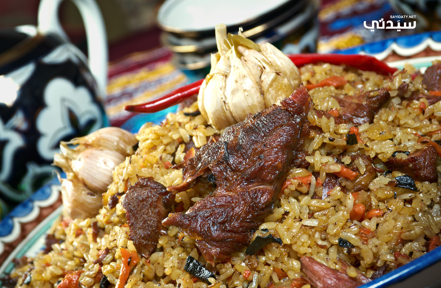 - عند التقديم، يُرفع الثوم والفلفل جانباً، ثم يُقلّب القِدر، أو يوضع الأرز أولاً في طبقٍ واسعٍ، ويوضع فوقه الجزر واللحم، ويُزيّن برؤوس الثوم والفلفل، يُقدّم عادةً مع سلطة أتشيك تشوتشوك (طماطم وبصل وفلفل حار).