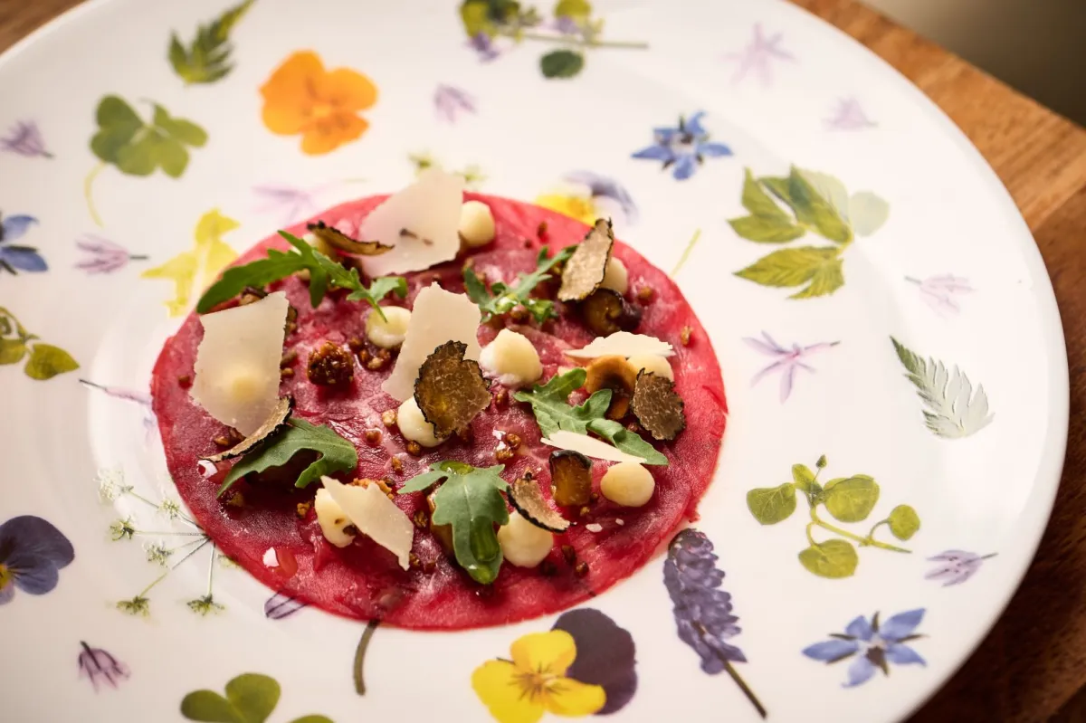 ومن جهة أخرى، فإن الضيوف سوف يتمكنون أيضاً من الاستمتاع بطبق كارباتشيو، وهو عبارة عن تحفة طهي تضم لحم البقر المشوي بالكمأة، مصحوباً بفطر بورسيني. ويضفي هذا الطبق المغطّى بالجرجير الطازج والبندق المكرمل بشكل جميل للغاية نكهة لذيذة على كل قضمة.