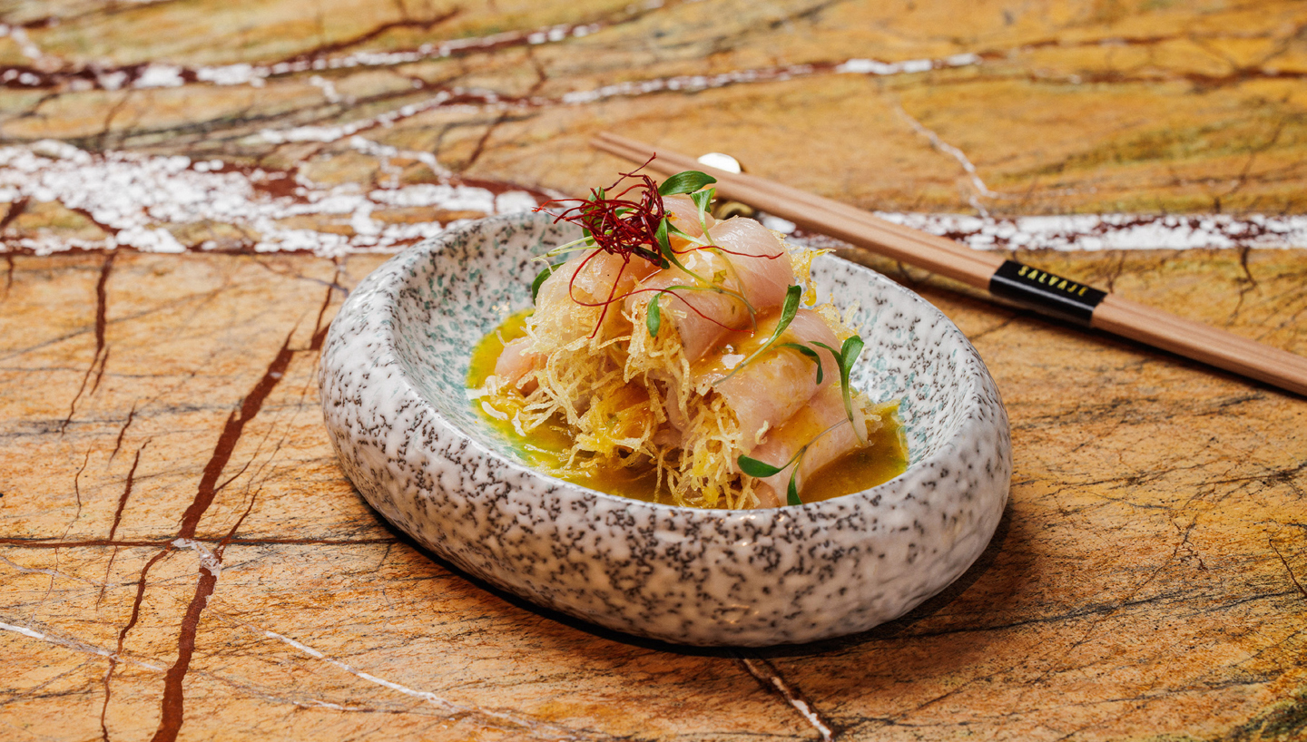 هذا الطبقُ، هو نوعٌ من الساشيمي، أو سمك الهماتشي الياباني النيئ مع صوصٍ حمضي، وتزيينٍ فاخرٍ