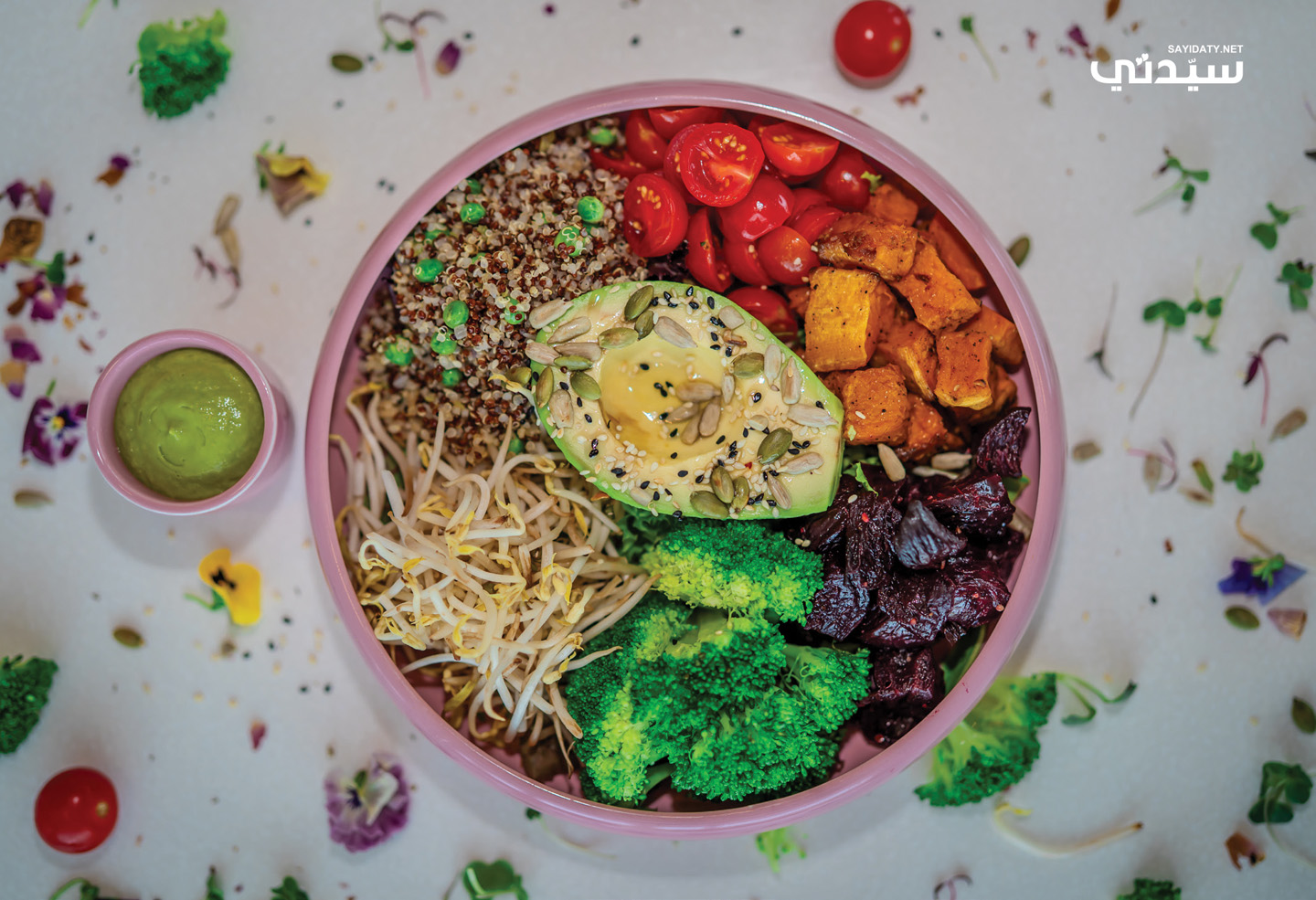 - في وعاء سلطةٍ كبيرٍ، رتِّبي الشمندر المشوي، واليقطين المشوي، والطماطم الكرزية المتبَّلة، والبروكلي المسلوق، وخليط الكينوا والبازلاء الخضراء جنباً إلى جنبٍ، ثم ضعي نصف حبة الأفوكادو المتبَّلة في وسط الوعاء، وقدِّمي الطبق مع صلصة الخضروات الخضراء على الجانب.